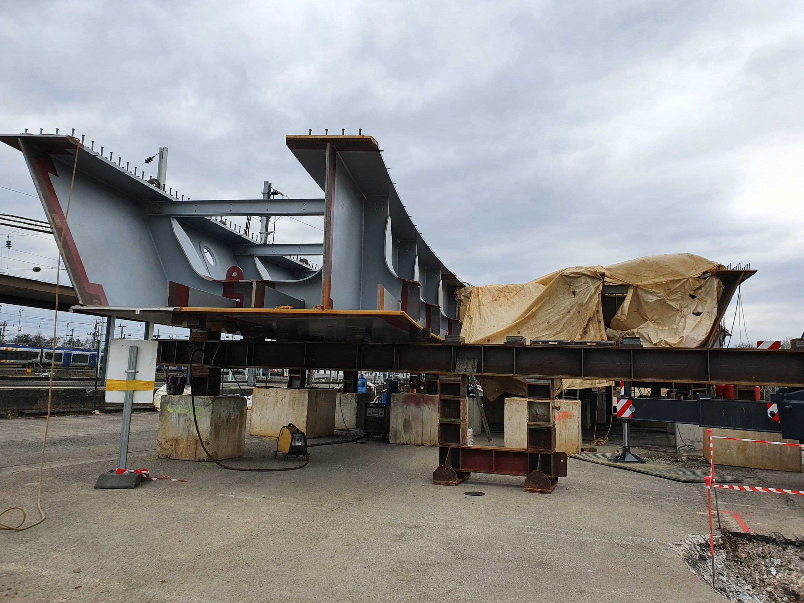 Pour le moment, « on est dans le planning », confirme Sylvaine Schlienger. Et cela malgré un retard de trois semaines dû à des difficultés d’approvisionnement et des modifications sur les coupures de caténaires. « Il faut s’arranger avec tout le monde. » Finalement, le retard est rattrapé. Commencé en décembre 2021 – avec des sondages pyrotechniques car le terrain présentait des risques avec des bombes potentiellement oubliées de la Seconde Guerre mondiale – le chantier devrait s’achever dans les délais escomptés, à l’été 2024. Une dernière étape de lançage plus sensible attend encore les équipes. Il s’agit du virage qui viendra terminer le pont. « Nous allons ensuite procéder au grutage du virage », développe Sylvaine Schlienger. Une phase qui interviendra lors du week-end de la Pentecôte et qui permettra de relier le tablier à la rampe d’accès donnant sur le quai. À quelques mètres seulement, l’assemblage des différents éléments du virage a déjà commencé sur le parking Effia. Plusieurs trous y ont également été creusés. « On regarde où sont les réseaux car il nous faut une inclusion rigide pour maintenir la grue », précise la technicienne du Smitu. Celle-ci fera bientôt son apparition dans le paysage thionvillois et marquera une étape cruciale du chantier.