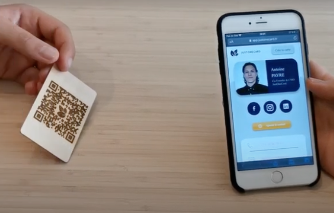« 80% des cartes papier sont jetées après deux semaines. » C’est de ce constat qu’est née la « Just One Card », une carte de visite connectée développée par trois étudiants de l’École des Mines de Nancy. Le concept ? Une carte unique en bois recyclé équipée d’une puce NFC permettant de transmettre instantanément ses coordonnées. Le concept est simple mais terriblement efficace. Il suffit de scanner la carte à l’aide d’un smartphone pour télécharger la fiche contact du possesseur de la carte et de l’ajouter en un clic à son répertoire.