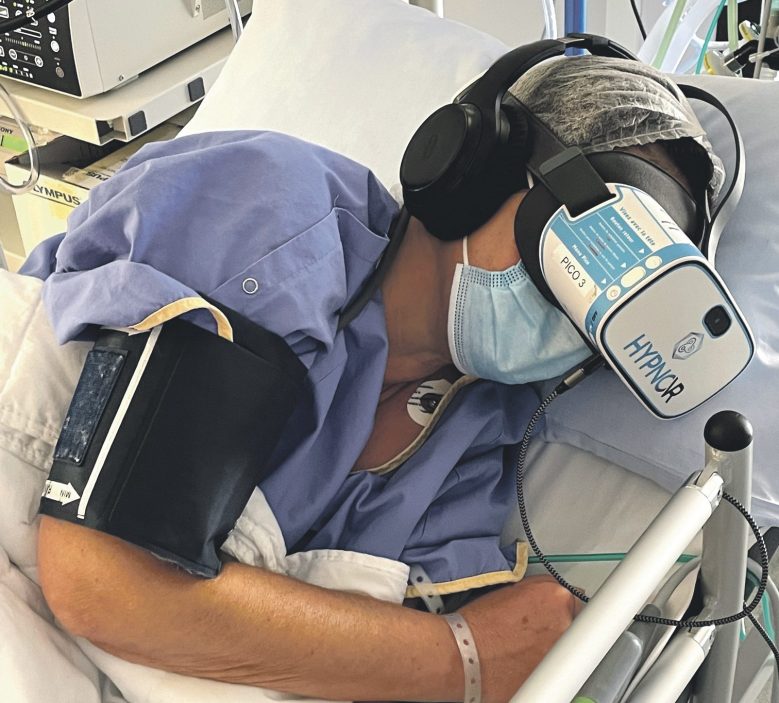 Nous avons commencé cette expérimentation il y a un peu plus de deux mois car le casque de réalité virtuelle (VR) donne la possibilité de mettre le patient dans un état modifié de conscience assez facilement. Le casque VR c’est un peu l’hypnose prête à l’emploi ! C’est assez ludique et le fait de passer par l’image et le son réduit l’appréhension des patients qui ont parfois un peu peur de l’hypnose médicale « classique ». Comme ces casques sont aussi utilisés dans les jeux vidéos, certains ont pu y voir un gadget en médecine, ce n’est pas le cas. Ils ne sont pas indispensables mais ils sont très utiles et permettent de diminuer de 75 à 80% les doses de produits anesthésiants. La confrontation avec le bloc opératoire, le bruit, la lumière, l’environnement global peuvent susciter de l’appréhension, l’utilisation du casque déconnecte le patient de cet endroit anxiogène et rend l’intervention plus acceptable. C’est un élément supplémentaire dans la prise en charge des malades qui améliore leur vécu de l’examen ou de l’intervention. C’est un aspect très important de la prise en charge et cela permet, en plus, une meilleure récupération et un retour plus rapide à domicile.