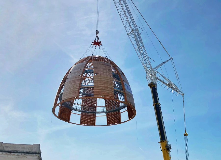 #images Une étape importante pour le chantier #NancyThermal : pose ce mercredi par les équipes de @BouyguesBat_NE du nouveau dôme en bois des Vosges sur le toit du futur centre thermal ! ♀️ Plus de 1️⃣3️⃣ mètres de hauteur de charpente et un poids de 1️⃣4️⃣ tonnes ! pic.twitter.com/Q1s6PqjXbR