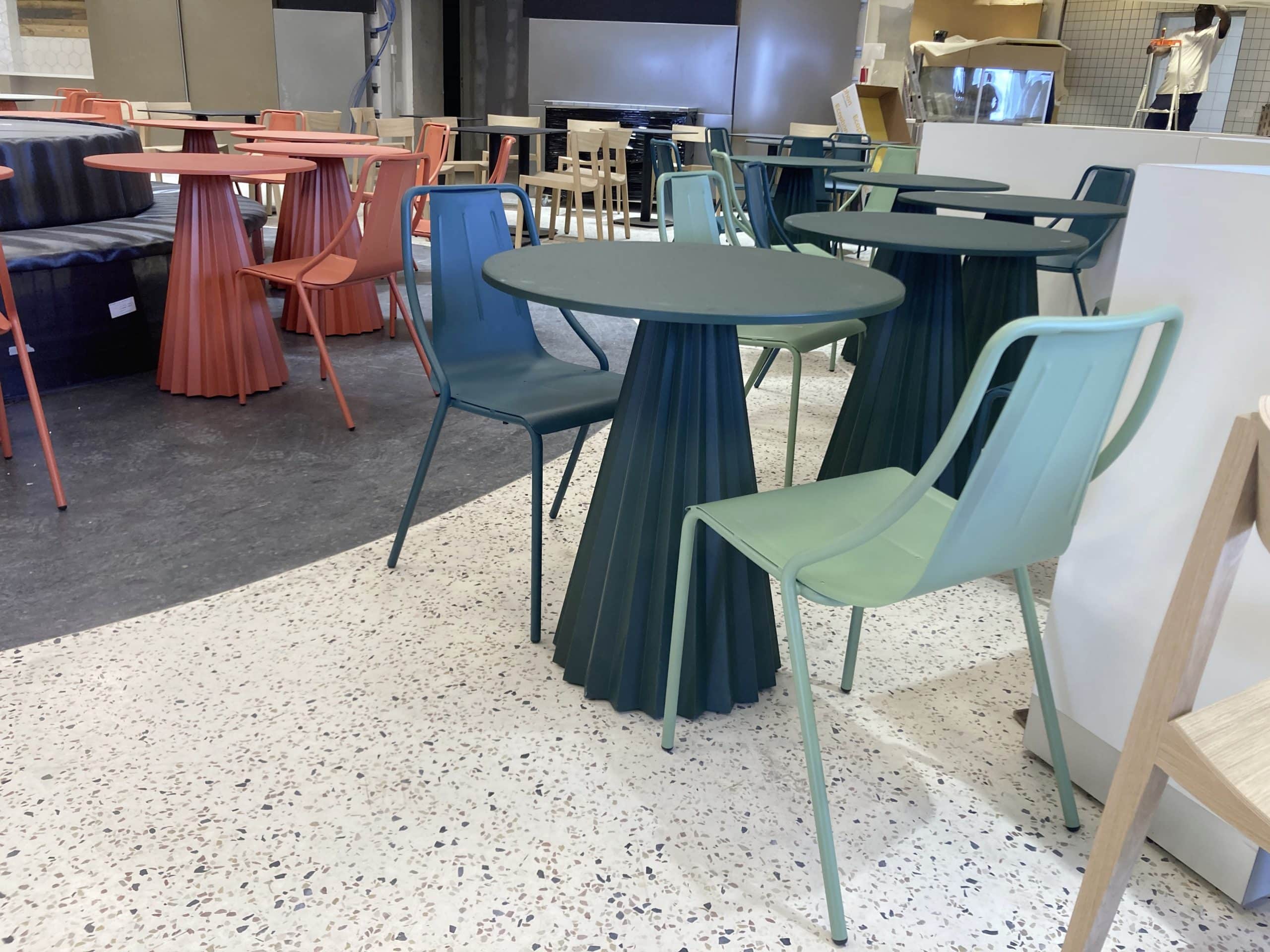 Au rez-de-chaussée et sur la mezzanine, le food court se dévoile sur 800 mètres carrés (auxquels s’ajoutent les 200 mètres carrés de terrasse). Six bornes permettront de passer les commandes et le service se fera à table, à l’aide de chevalets géolocalisés. « Nous souhaitions avoir l’esprit food court, avec le service en plus. » Les cuisines, en cours d’installation, laissent entrevoir leurs univers : esprit salon de thé façon chez grand-mère pour l’enseigne Émilie and the Cool Kids, tons naturels pour Bio Burger, moderne et sobre pour La Pizza de Nico, les trois franchises retenues pour assurer la partie restauration.