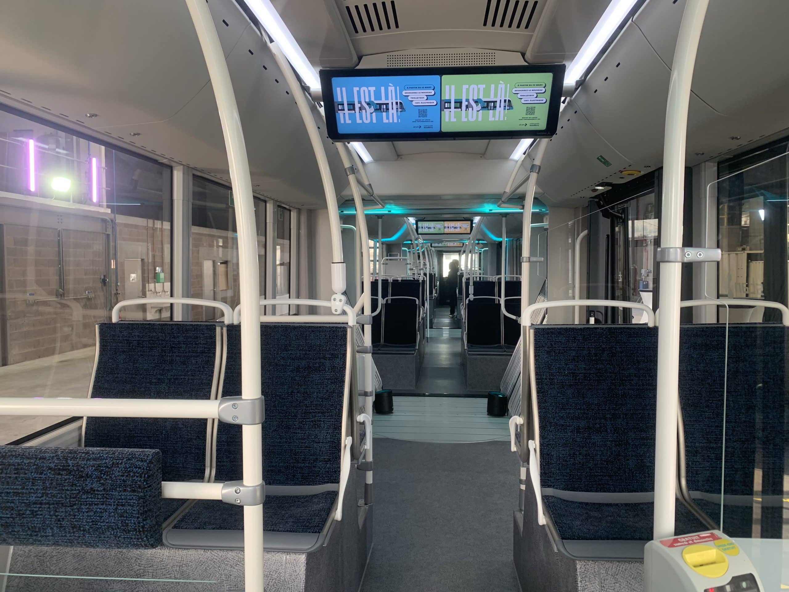 Quand on monte à bord, la première impression est celle d’un véhicule plus grand et plus lumineux que l’ancien tram. Le niveau d’équipements est présenté comme optimal, permettant d’accueillir à la fois, les poussettes, les personnes à mobilité réduite ou les malvoyants : sept places adaptées là où il n’y en avait qu’une dans l’ancien tram. Dans le trolley, plus question de taper la causette avec le conducteur : ce dernier est complètement isolé dans une cabine indépendante qui n’est plus située dans l’axe de l’entrée, un choix de la Métropole de Nancy. Olivier Thouvenin est ancien chauffeur chez Keolis, responsable du projet trolley. Il nous présente ce mardi le petit nouveau, qu’il a déjà pu conduire comme cinq de ses collègues ce week-end après une formation. « C’est très agréable, confie-t-il, car le poste de conduite est aéré. Comme tous les véhicules électriques, il est très souple, sur l’accélération et le freinage. La prise en main est facile, quand on est habitué aux dimensions de l’ancien tram. » Il précise même cette particularité du nouveau véhicule qui le rend moins large : l’absence de rétroviseurs extérieurs, remplacés par des caméras.