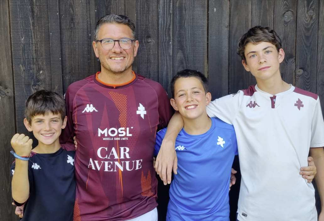 Philippe Marque, entouré de ses fils Gabin, Oscar et Baptiste (de g. à d.). Une même passion grenat. Photo DROriginaire de Dax, il est supporter des Girondins de Bordeaux. Depuis plus de vingt ans, c’est pourtant à Saint-Symphorien que Philippe Marque, président du Club de la presse de Metz, entraîne ses quatre enfants, tous nés en territoire grenat. Une histoire de filiation.