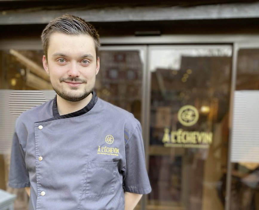 « Le restaurant À L’Échevin, hôtel Le Maréchal (quatre étoiles), une bâtisse du XVe siècle à Colmar. Une brigade de neuf personnes sous mes ordres, alors que nous étions moins de trois chez À Table (sourire). La famille Bomo, à la tête de l’établissement, m’a donné carte blanche. C’est très valorisant. Le premier service a eu lieu le 3 mars. Les retours sont positifs. Élise me rejoindra prochainement dans cette nouvelle aventure. Elle est pour beaucoup dans ma passion et ma créativité. Ce qui change par rapport à Metz, c’est que compte tenu des effectifs je vais pouvoir pousser mes idées encore plus loin. J’ai un chef pâtissier, des chefs de partie… Je vais approfondir mes recherches, ma réflexion, mes décors. Travailler sur des choses qui m’étaient inaccessibles lorsque j’étais seul. Peaufiner ma cuisine afin qu’elle soit encore plus juste. »