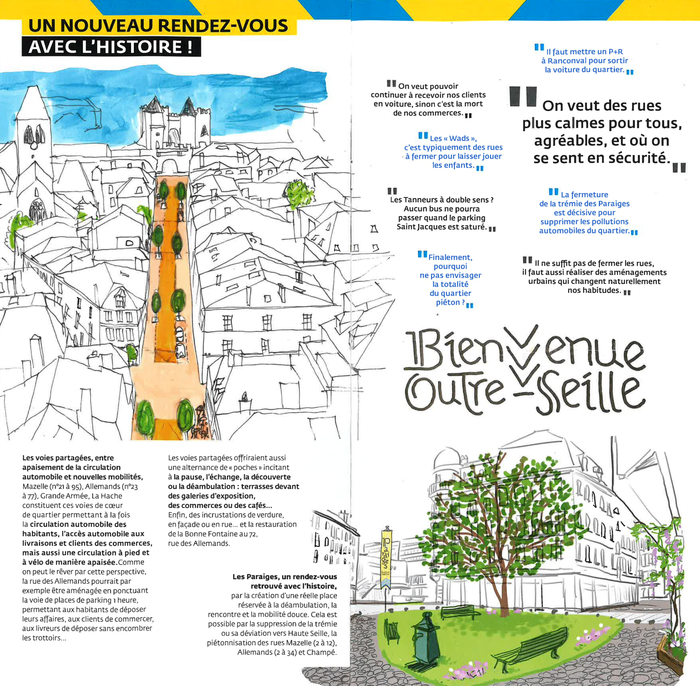 L’autre, plus sophistiqué en termes de mise en page comme de contenu, est un huit-pages en hauteur signé par la présidente de l’association « Oui, vivre en Outre-Seille » et par le président des commerçants du quartier. Il est daté de mars et se propose de faire le compte rendu de la concertation sur le projet de mobilités en Outre-Seille. Une réponse structurée à une préoccupation déjà ancienne dans le quartier, mais aussi à une proposition précise du maire de Metz. En février, celui-ci avait fait part de sa décision de « piétonniser de manière expérimentale la rue des Allemands » en ayant une approche globale, concertée avec les habitants du secteur.