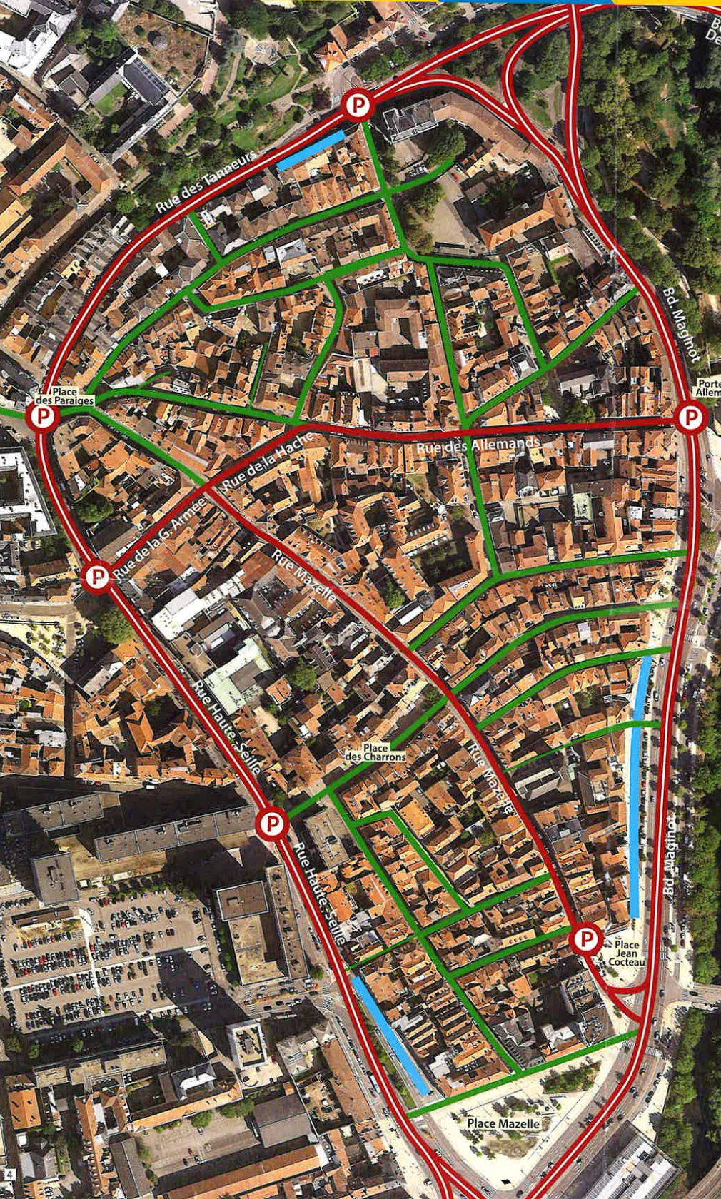 • Tout le reste, rues et ruelles sont prioritairement réservées à la marche et aux mobilités douces.