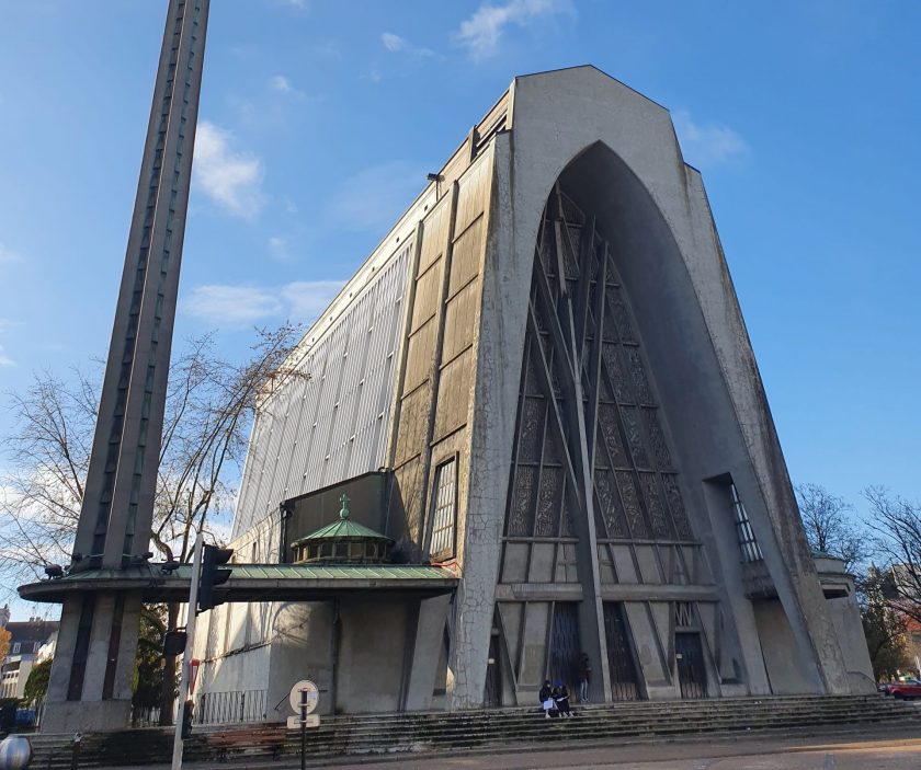 Il paraît que pour l’aimer, il faut la comprendre. Et que pour la comprendre, il faut la connaître. L’église Sainte-Thérèse déclenche des réactions épidermiques, ne laisse pas indifférent. Difficile de ne pas s’arrêter devant cet édifice dont la physionomie a de quoi surprendre. Elle a la forme d’une carène, partie immergée d’un bateau, inversée. Ses proportions parlent d’elles-mêmes : 78 mètres de long, 30 mètres de haut, 25 mètres de large. Sa flèche s’élève à 70 mètres. L’originalité et la modernité de l’église se trouvent dans l’utilisation de béton pour sa construction. Un choix résolument novateur pour l’époque : le milieu des années 30. Le reste de la magie opère à l’intérieur : 1 000 mètres carrés de vitraux claustras dessinés par Nicolas Untersteller qui forment le ciel de Sainte-Thérèse. Voilà pour le passé.
