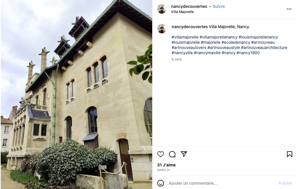 La villa Majorelle, une œuvre de l’architecte Henri Sauvage construite vers 1901-1902 pour l’artiste Louis Majorelle, classée Monument historique, est une maison emblématique de l’Art nouveau nancéien. Près de 100 pièces de mobilier, des peintures et des objets d’art issus des collections du musée de l’École de Nancy, y sont présentées. Certaines proviennent de cette maison, d’autres ont été choisies afin de restituer l’ambiance d’un intérieur Art nouveau. Intérieur et extérieur, tout est passé à la loupe par les influenceurs.