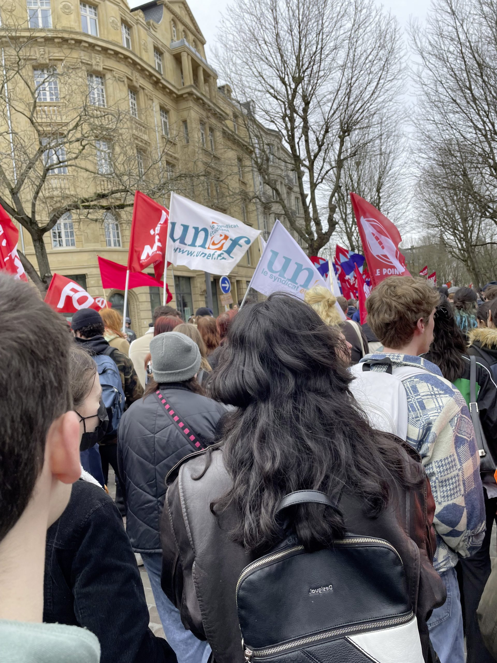 « J’essaie de ramener un maximum de monde à chaque fois, car cette réforme nous touche tous, que ce soit les jeunes ou les plus âgés », explique un élève du lycée de la communication. Âgé de 17 ans, casquette grise vissée sur la tête, il porte un autocollant du mouvement des Jeunes communistes français sur la poitrine. « Rien que dans notre lycée, il y a deux fois plus de monde qui vient depuis le début du mouvement social », poursuit-il. Il est fier d’avoir participé « à presque toutes les manifestations ». Fier de s’être mêlé à la foule des protestataires, le 19 janvier. Fier de s’inscrire dans un mouvement et de « faire l’histoire ». Ils forment tous une bande, inscrits dans le même établissement, qui participent ensemble. « Pas unis par les mêmes idées mais soudés par le même combat. »