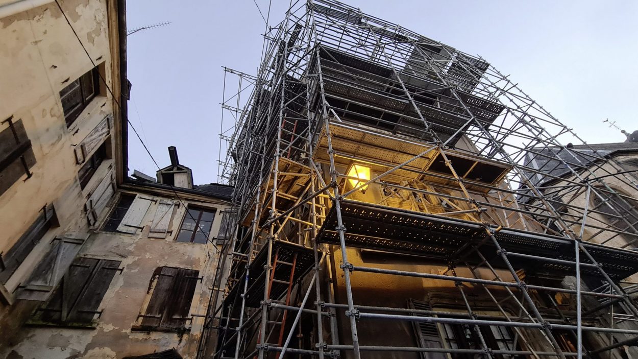 Un échafaudage a été mis en place autour de la Maison du drapier en attendant les travaux. Photo La SemaineMenacée de disparition en raison de son délabrement, la Maison du drapier a mobilisé de nombreuses associations et même Stéphane Bern. Elle vient d’être classée, du moins en partie, au titre des Monuments historiques.