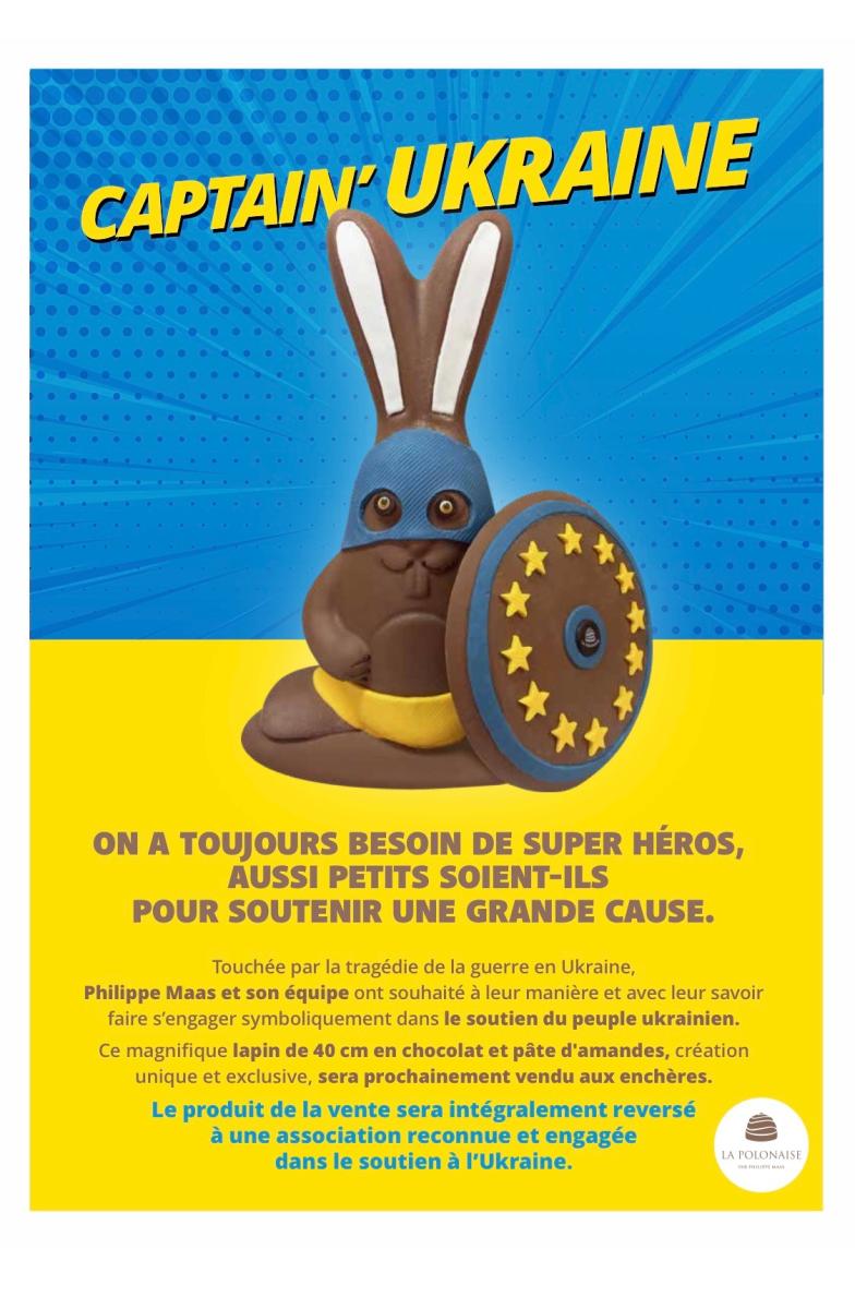 Le pâtissier Philippe Maas a créé un lapin en chocolat unique pour venir en aide aux Ukrainiens.Il a l’habitude des initiatives originales, et surtout un cœur gros comme un lapin de Pâques. Cette année, le sien, de lapin, sera inédit et solidaire. Philippe Maas a créé un personnage pour une très bonne cause. Voici donc Captain’Ukraine, un lapin de 40 centimètres en chocolat et en pâte d’amande, qui sera prochainement vendu aux enchères. « On a toujours besoin de super-héros, aussi petits soient-ils, pour soutenir une grande cause », explique le pâtissier messin, installé au 6 rue Harelle. Un symbole et une action qui collent bien aux valeurs défendues par le créateur de La Polonaise by Maas. Le produit de la vente sera intégralement reversé à une association engagée dans le soutien à l’Ukraine.