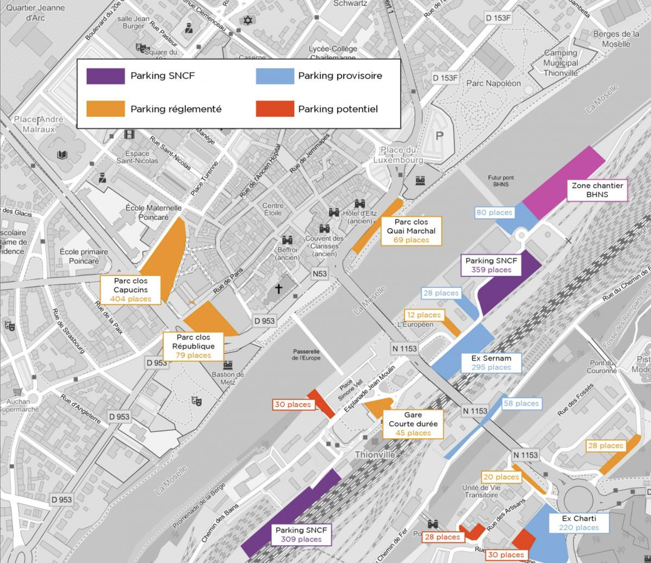 Ces travaux vont entraîner des perturbations notamment au niveau du stationnement. De mardi 11 janvier jusqu’au 20 février, 76 places de stationnement vont être neutralisées sur le parking du Bastion. 30 places y seront de nouveau ouvertes à partir du 21 février. De plus, la municipalité de Thionville indique via un communiqué qu’à compter du 1er février « un parking provisoire et gratuit de 30 places de stationnement sera mis à disposition à côté de La Passerelle de l’Europe (côté gare)». Elle précise également que 30 autres places seront disponibles rue des Ecluses et que des négociations sont en cours avec la SNCF afin de libérer 395 emplacements de stationnement sur le chemin des Bains.