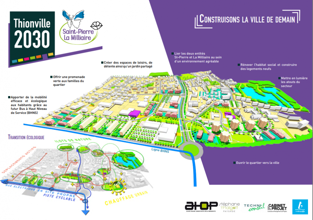 Désenclaver le quartier, améliorer son image, faciliter la circulation, apporter de la mixité sociale, rénover les équipements publics, connecter le quartier au futur BHNS (bus à haut niveau de service), intégrer de la dimension développement durable dans les opérations de requalification… C’est l’ambition de la Ville de Thionville qui entend « lier » les quartiers Près Saint-Pierre et Milliaire pour qu’ils n’en fassent plus qu’un. C’est l’un des sept grands chantiers initiés dans le cadre de Thionville 2030.