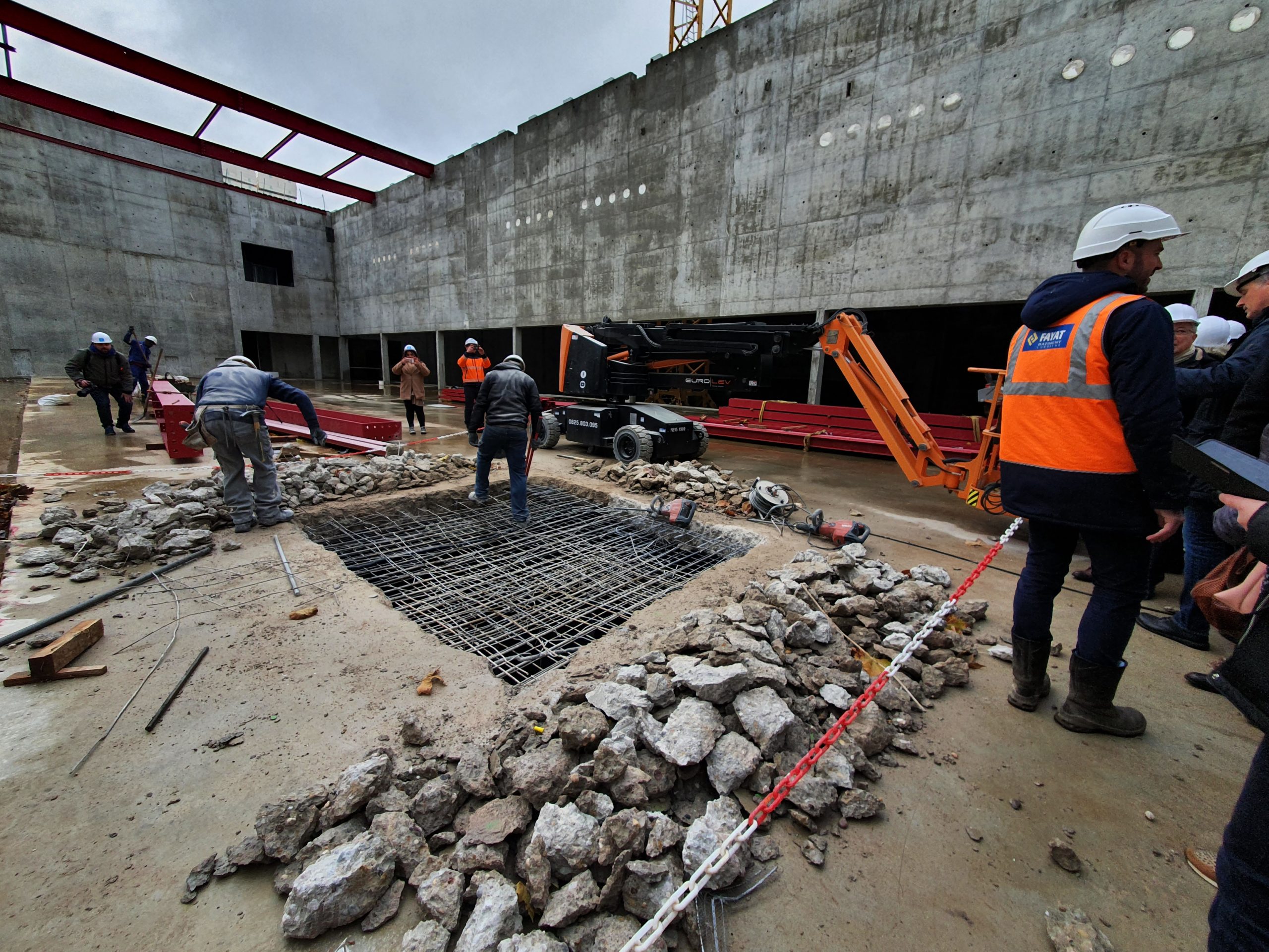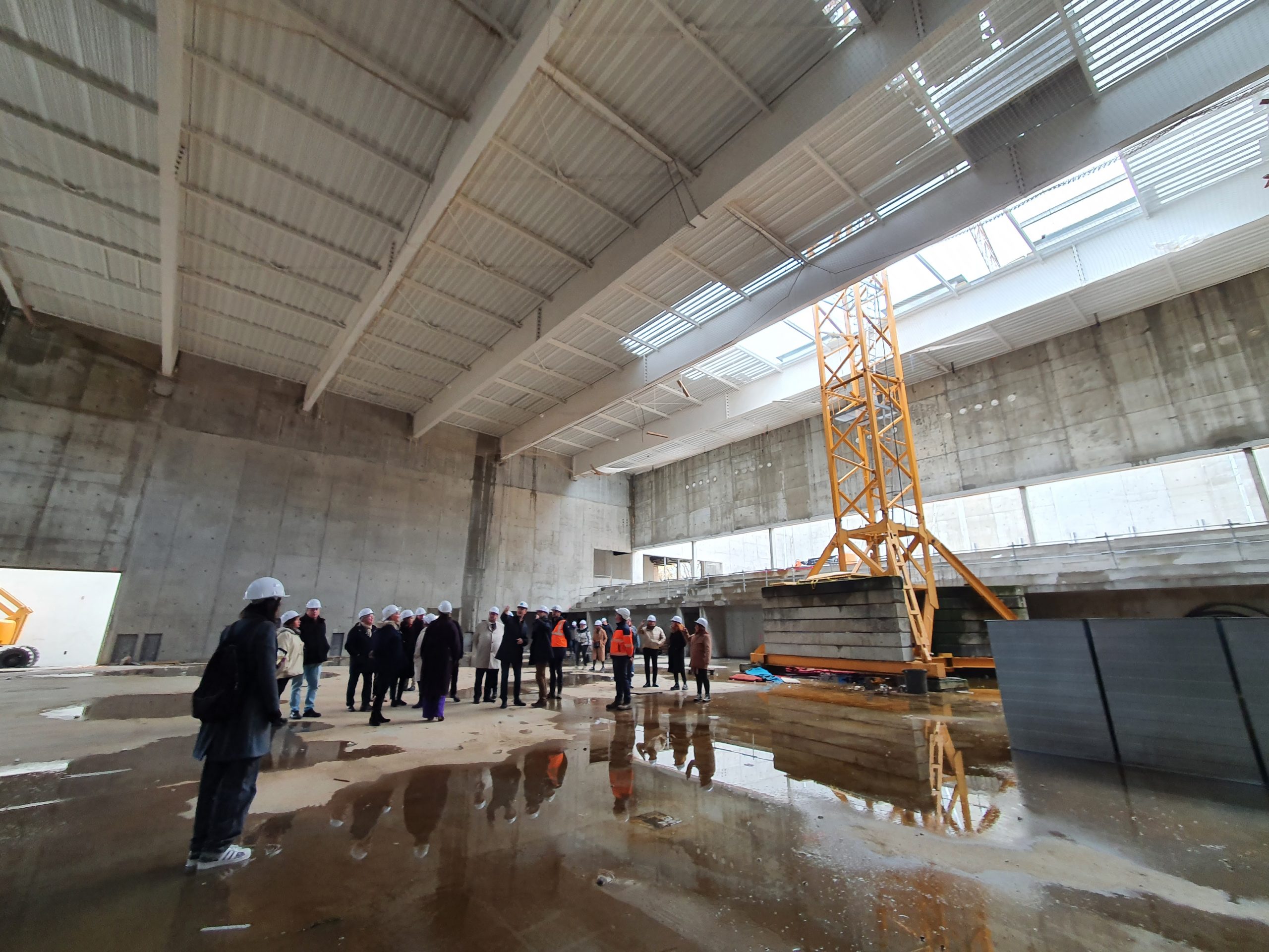 Débutée à l’été 2020, la reconstruction du complexe sportif et culturel Jean-Burger suit son cours en cœur de ville. La livraison, retardée, est annoncée pour la fin de l’année 2023, en raison de difficultés d’approvisionnement et d’une défaillance d’entreprise. « La Semaine » vous emmène dans les coulisses de ce chantier « peu ordinaire ». Si depuis l’installation des marchés de Noël la City Skyliner surplombe la ville de Metz, c’est un tout autre repère qui retient l’attention du côté de Thionville. Une immense grue. Une de plus, me direz-vous ? Peut-être bien mais celle-ci occupe LE chantier de cette mandature, celui que tout le monde devra retenir : la réalisation du futur complexe sportif et culturel Jean-Burger. « C’est le projet qui va marquer la ville avec la construction des deux ponts (portée par le Smitu dans le cadre du bus à haut niveau de service, ndlr) », soutient Pierre Cuny, le maire de Thionville. À deux pas du parking de la Libération, ce chantier qui pèse 14 millions d’euros TTC est l’objet de toutes les curiosités et s’est intégré au fil des mois dans le quotidien des Thionvillois. Il est d’ailleurs tentant de vérifier son état d’avancement au moment de garer ou de récupérer sa voiture. La Semaine a eu le droit à un peu plus que cela, lundi 21 novembre, grâce à une visite de chantier organisée par la municipalité. Une visite qui a réuni du beau monde avec la présence de nombreux élus dont la députée Isabelle Rauch (Horizons). Pour l’occasion, Sébastien Gerroldt, le directeur du patrimoine bâti, s’est glissé dans la peau du guide nous présentant les coulisses d’un édifice de 4 400 mètres carrés qualifié de « peu ordinaire », tant par sa dimension physique que ses spécificités techniques. « Nous sommes plus sur de l’ouvrage d’art et de génie civil », précise-t-il.
