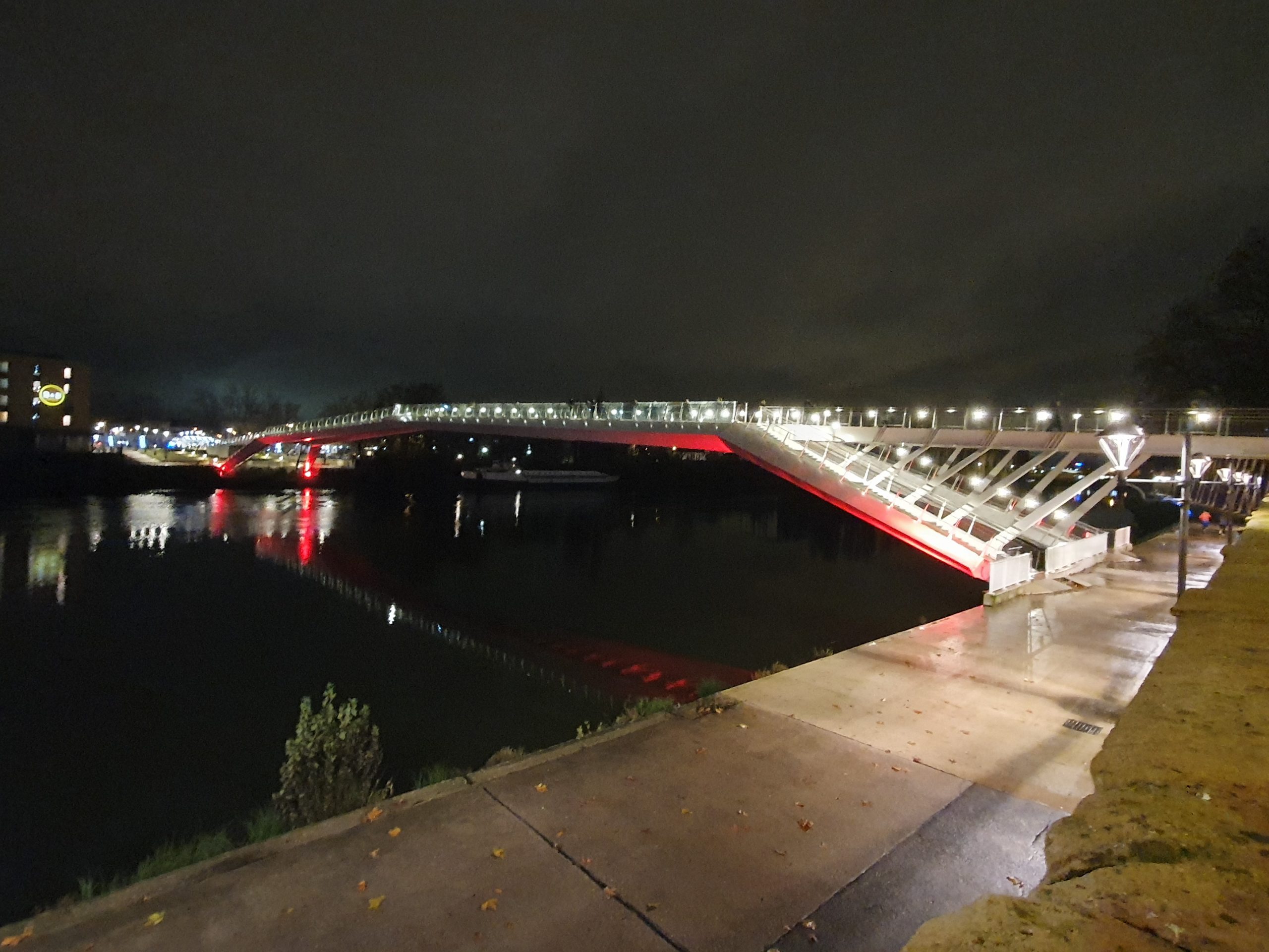 Alors que la nuit s’installe, elle surplombe la Moselle comme si elle avait toujours été là. En ce lundi soir, elle a quitté sa couleur européenne pour se parer de rouge et s’accorder, ainsi, avec les festivités de Noël en approche. On se plaît à l’observer, paisiblement. Autour de nous, règne le calme, à quelques dizaines de mètres seulement du pont des Alliés où défilent les voitures. L’heure de pointe se rapproche. Sur la passerelle de l’Europe aussi, les piétons se suivent, accompagnés parfois par quelques cyclistes. Une scène de vie comme on en voit tant d’autres. Mais une évidence qui n’en était pas une si l’on remonte le fil de l’histoire. Car ce projet très contesté en a fait couler, de l’encre… Qualifié d’ « inutile » par certains car à proximité directe du pont des Alliés. Montré du doigt parce que « trop coûteux » par d’autres. Une enveloppe de 6,6 millions d’euros tout de même, rien que sur l’ouvrage, financée à hauteur de 5,5 millions par des aides de l’État, de la Région, du Département, et de l’Union européenne. Avec les aménagements réalisés autour, on atteignait les 10 millions. Alors, maintenant, qu’elle est là, qu’est-ce qu’on en pense ? On est allé le vérifier sur place.