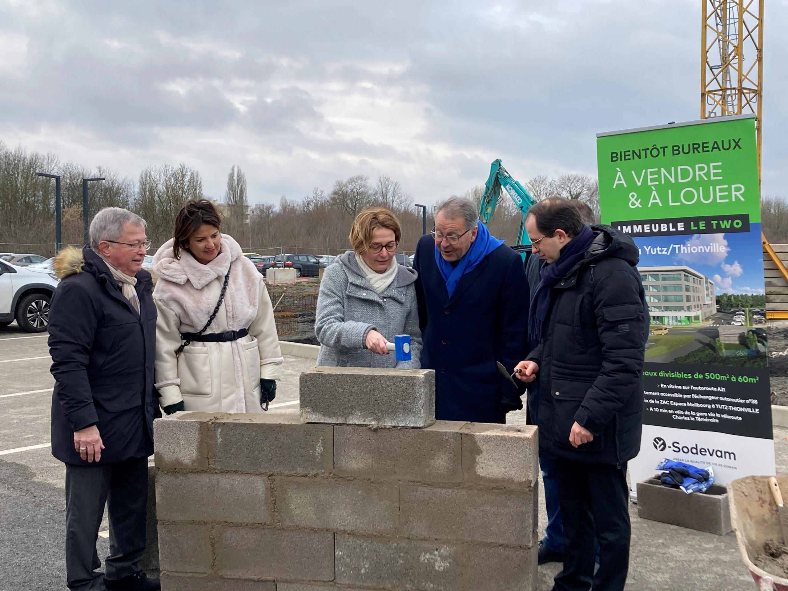 Les automobilistes qui tracent leur route ne s’imaginent pas ce qui se trame au pied de la bâtisse, jeudi 19 janvier au matin. À proximité directe du chantier, quelques truelles et parpaings viennent marquer le début d’une nouvelle aventure : la naissance d’un petit frère. Un deuxième bâtiment qui « répond à une vraie dynamique de territoire et à un besoin en immobilier tertiaire pour les entreprises venant s’y développer », souligne Armel Chabane, président de la Sodevam, l’aménageur de la ZAC de Meilbourg depuis 2008 pour l’agglomération Portes de France-Thionville.
