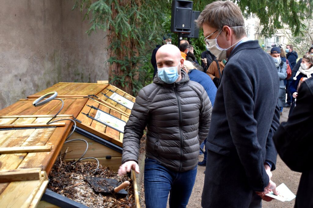 Mathieu Klein, président de la Métropole du Grand Nancy et maire de Nancy, et Michel Breuille, vice-président du Grand Nancy délégué à la prévention et à la gestion des déchets, ont inauguré mercredi 17 mars l’îlot de compostage partagé du parc Blondlot.