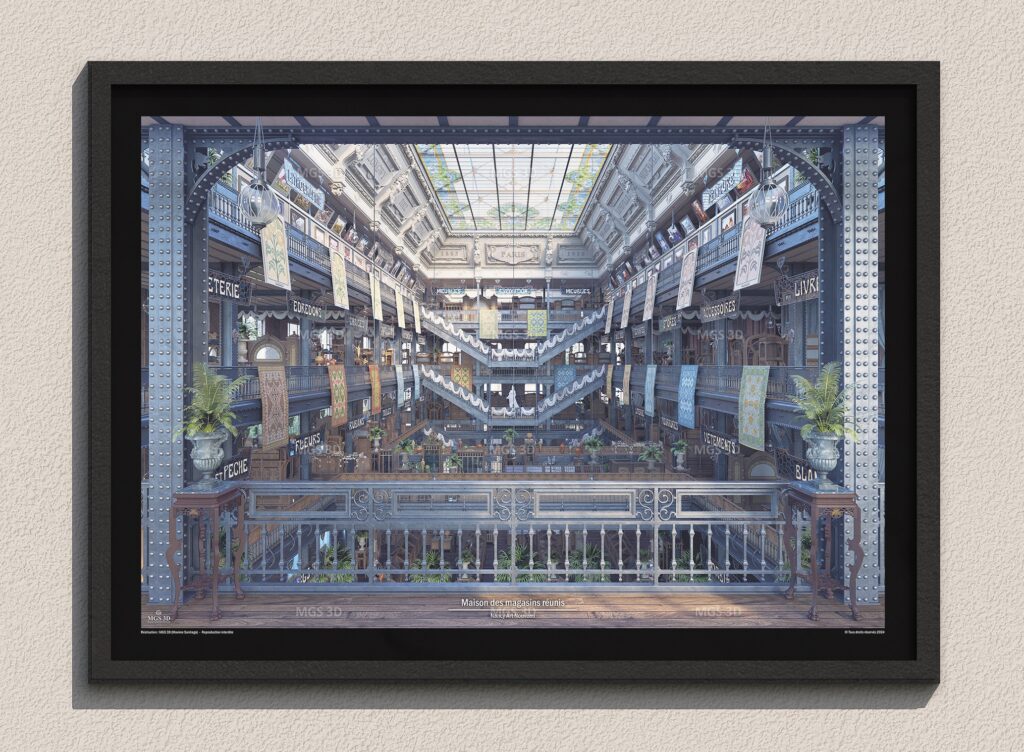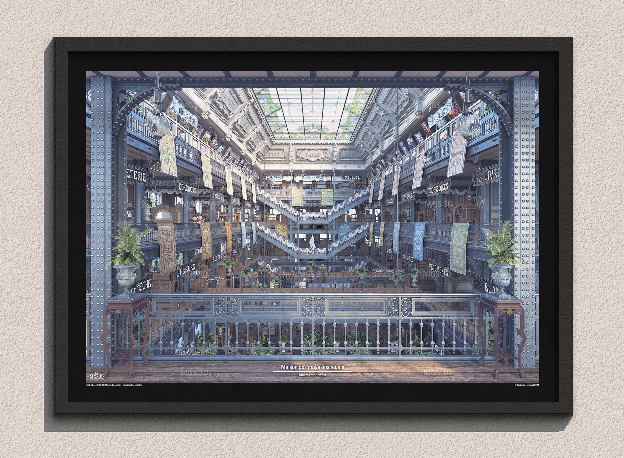 Quand Maxime Santiago s’intéresse à un bâtiment, c’est qu’il n’existe plus. C’est le cas de l’opéra de Léopold, abandonné au profit de celui de la place Stan. C’est aussi le cas des magasins réunis qui avait déjà fait l’objet d’un premier travail de recherche : on y découvre le bâtiment avant sa destruction par un incendie en 1916 et sa reconstruction dans le style art déco qu’on lui connaît aujourd’hui. « À cette époque, explique Maxime Santiago, on a vraiment une architecture parisienne avec des angles marqués par des tours, des grandes fenêtres et un décor, on va dire, à peu près néoclassique avec des ajouts ici et là, que ce soit dans les verrières, que ce soit dans les marquises, dans l’immobilier et les décorations, vraiment plus portés sur l’art nouveau, l’école de Nancy. » Une affiche propose aussi d’en apprécier l’intérieur : « L’idée était de montrer la grande verrière Art nouveau, avec tous les rayonnages, le bel escalier majestueux. On se retrouve comme dans la Samaritaine de Paris. Et pour être un peu chauvin, c’est même plus beau que la Samaritaine de Paris. »