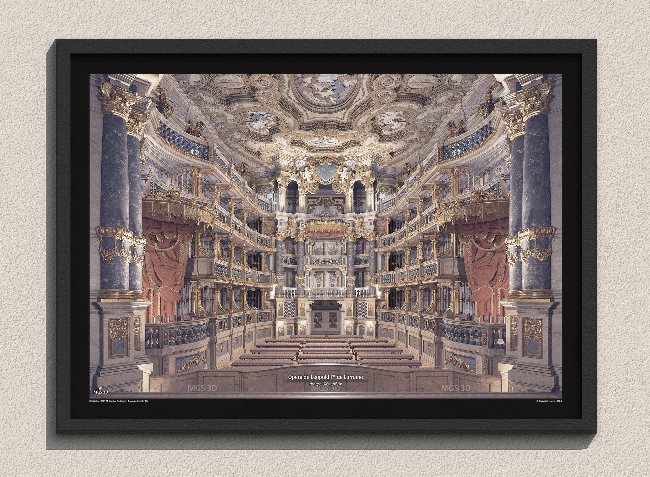Parmi les nouvelles vues, l’intérieur étonnant de l’ancien opéra du duc Léopold 1er de Lorraine. Située à l’époque à l’emplacement de l’actuelle police municipale derrière le musée lorrain, cette salle d’opéra baroque à l’italienne avec des décors et des formes riches, des dorures, était réservée à la cour et fut réalisée par l’architecte italien Francesco Galli dit Bibiena. Dans la série des affiches, c’est celle qui a demandé le plus de temps à Maxime Santiago. Il a souhaité la représenter depuis la scène, offrant certainement le meilleur point de vue pour contempler toutes ses richesses. Pour la dessiner le plus fidèlement possible il s’est basé sur les dessins techniques de l’architecte, parfaitement conservés et numérisés par le Metropolitan Museum de New-York.