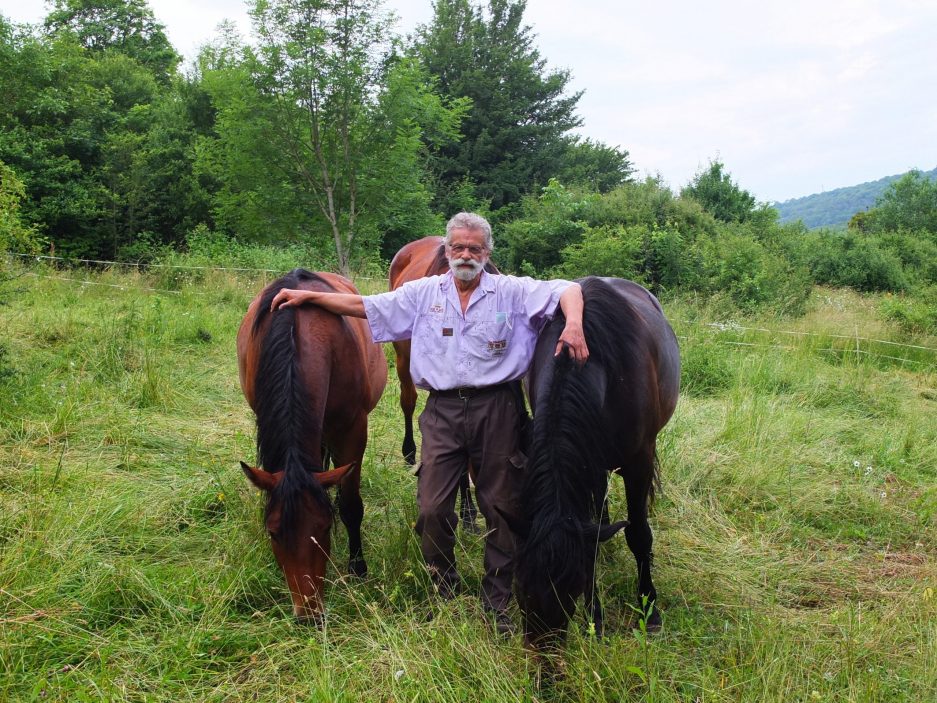 Jean-Claude Barthélémy entouré de Génépi (à g.), Falco (à dr.) et Only (à l’arrière-plan). Photo La Semaine