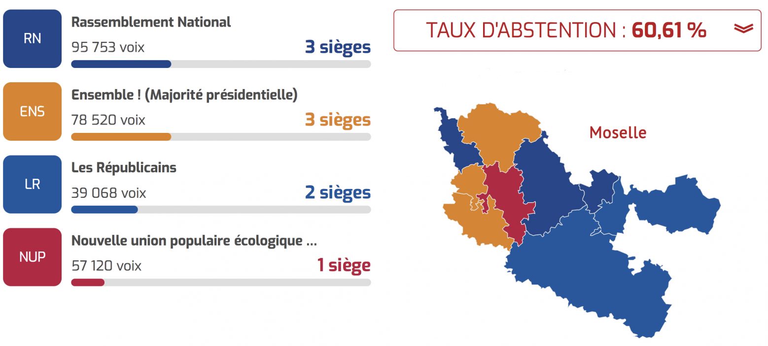 La Moselle, qui s’était jusqu’ici refusée à la droite de la droite aux législatives, compte depuis le 19 juin non pas un, mais trois députés issus de ses rangs. Inscrits dans la dynamique nationale du RN, Kévin Pfeffer (6e circonscription, Forbach), Alexandre Loubet (7e, Saint-Avold-Boulay) et Laurent Jacobelli (8e, Hayange-Florange) ont réussi leur pari. Avec leur succès dans les urnes, c’est toute la carte politique du département qui s’est redessinée. Ici aussi la majorité présidentielle a subi la vague de dégagisme de plein fouet : des huit députés élus en 2017, seuls Belkhir Belhaddad (Metz 1), Ludovic Mendes (Metz 2) et Isabelle Rauch (9e, Thionville) ont sauvé leur siège au Palais Bourbon. Ici aussi la Nupes a crié victoire par l’intermédiaire de Charlotte Leduc, sur Metz 3 où elle n’a devancé Françoise Grolet (RN) que de 797 voix. Ici en revanche, les Républicains s’en sont beaucoup mieux sortis qu’au national (61 députés contre 112 en 2017) avec la réélection de Fabien Di Filippo sur la 4e circonscription (Sarrebourg), lequel guidera les premiers pas de Vincent Seitlinger (5e, Sarreguemines) à l’Assemblée où les élus LR, d’ailleurs, auront un rôle intéressant d’arbitres à tenir. Un mot pour finir sur l’abstention. Celle contre laquelle plus grand monde ne s’offusque. Banalisée comme l’extrême droite, alors qu’elle aussi témoigne de l’effondrement de certaines valeurs, certains idéaux. Dimanche 19 juin, plus de 60 % des électeurs mosellans ont refusé de s’exprimer dans les urnes. Et demain, si on ne fait rien ?