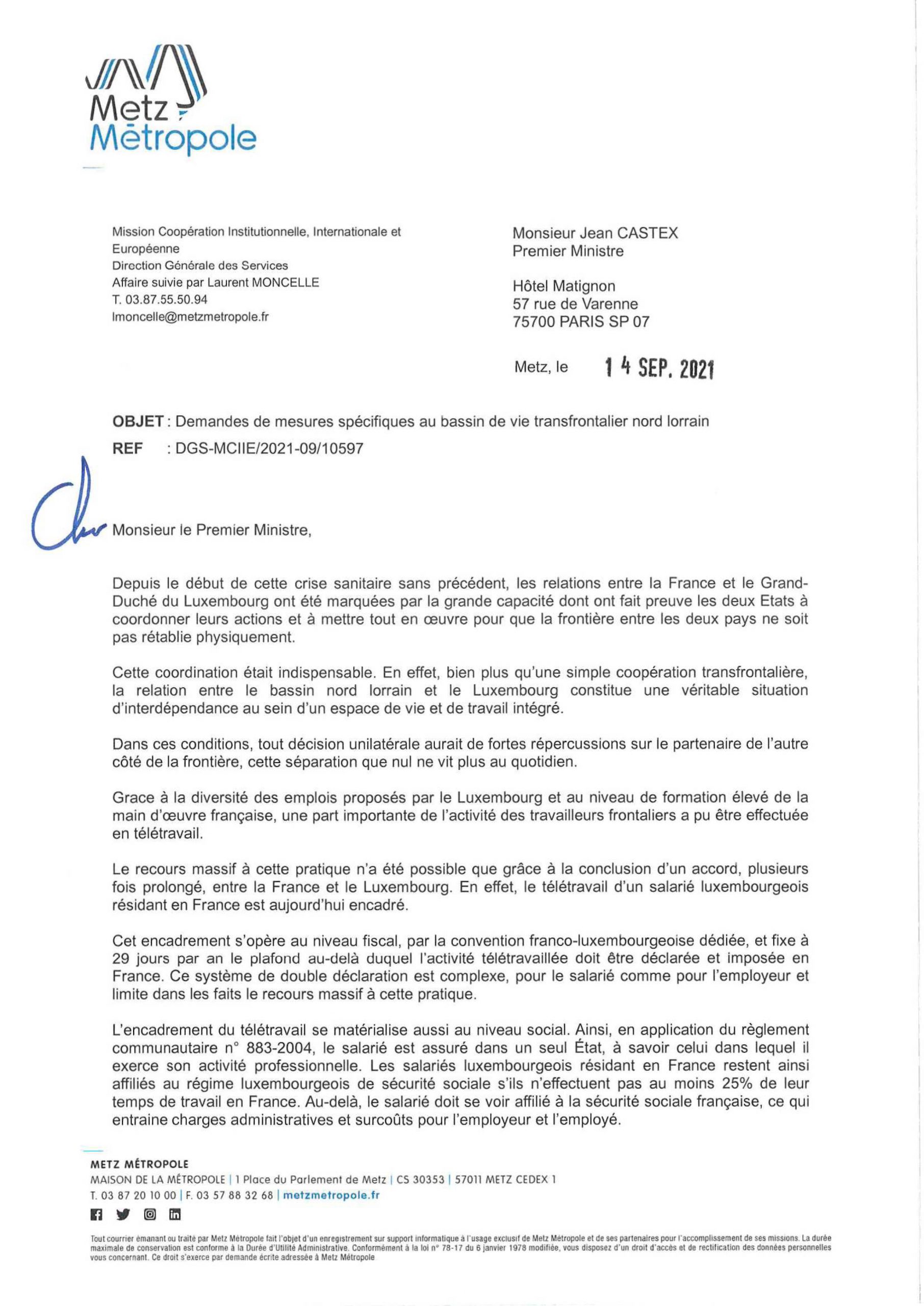 Dans une missive adressée à Jean Castex, François Grosdidier, maire de Metz et président de l’Eurométropole de Metz, plaide en faveur de l’extension du régime dérogatoire permettant aux frontaliers français de télétravailler jusqu’à la fin de l’année 2022. Aux yeux de l’édile messin, le travail à la maison est « un moyen d’agir simplement » en matière d’amélioration de la qualité de vie. « A minima, il me semble nécessaire que vous puissiez vous engager à prolonger le dispositif transitoire actuel pour toute l’année 2022 », appuie le président de Metz Métropole (LR) dans une longue lettre adressée au Premier ministre, en date du 14 septembre.