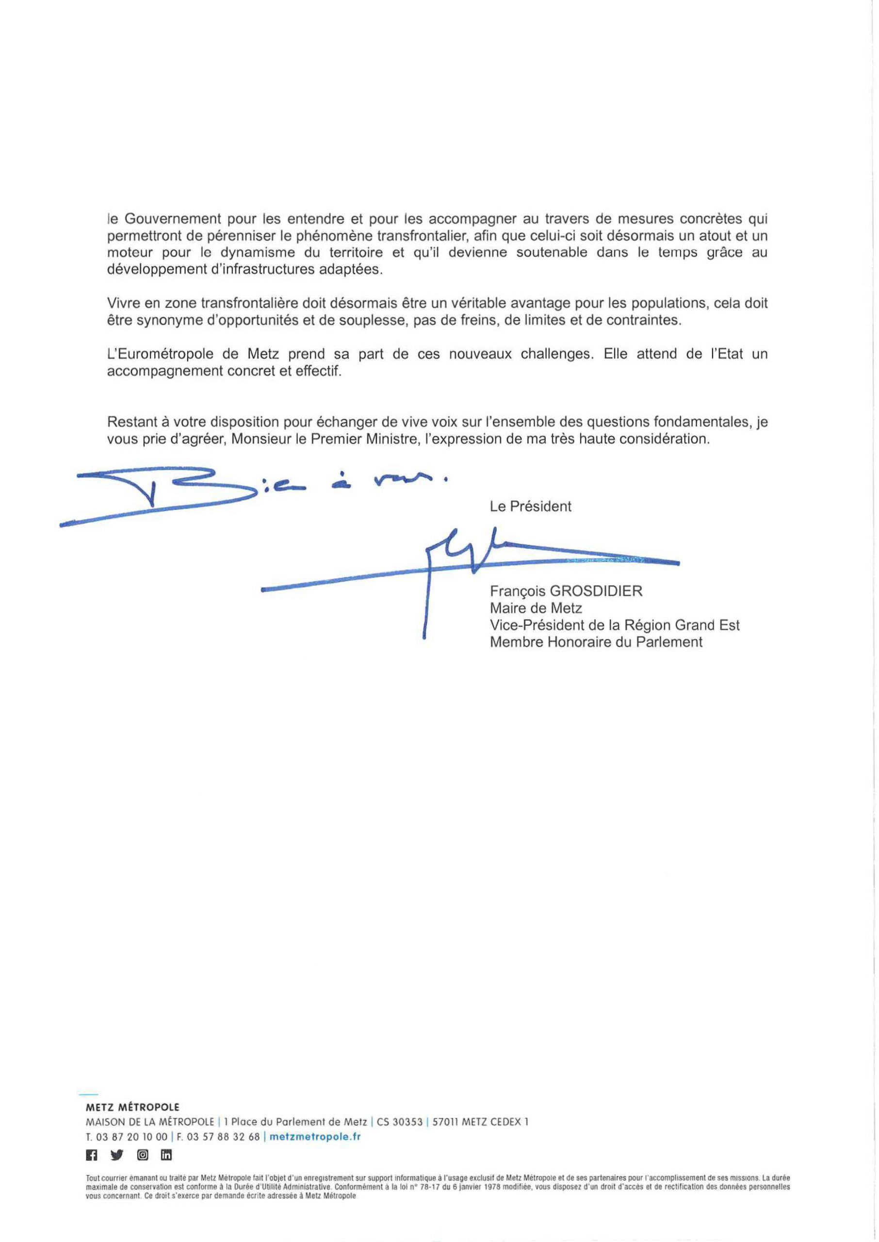Pour l’édile messin, les effets positifs du télétravail sont « nombreux et très directs pour le bassin métropolitain de Metz ». Dans son courrier adressé au Premier ministre, François Grosdidier cite notamment la revalorisation du marché de l’immobilier, le désengorgement des réseaux routiers ou encore la limitation des émissions carbone liées aux déplacements des frontaliers. Alors que nombre d’entre eux ont constaté une hausse d’imposition du côté français cette année, le président de Metz Métropole souhaite connaître le montant des recettes supplémentaires que cela représente pour la France, et encourage Jean Castex à « flécher ces ressources supplémentaires sur des projets d’intérêt transfrontalier, et notamment des infrastructures de transport ». François Grosdidier invite par ailleurs le Premier ministre à accélérer le dossier A31 bis, en rappelant sa position en faveur d’une écotaxe régionale plutôt qu’un péage sur la partie nord du tracé.