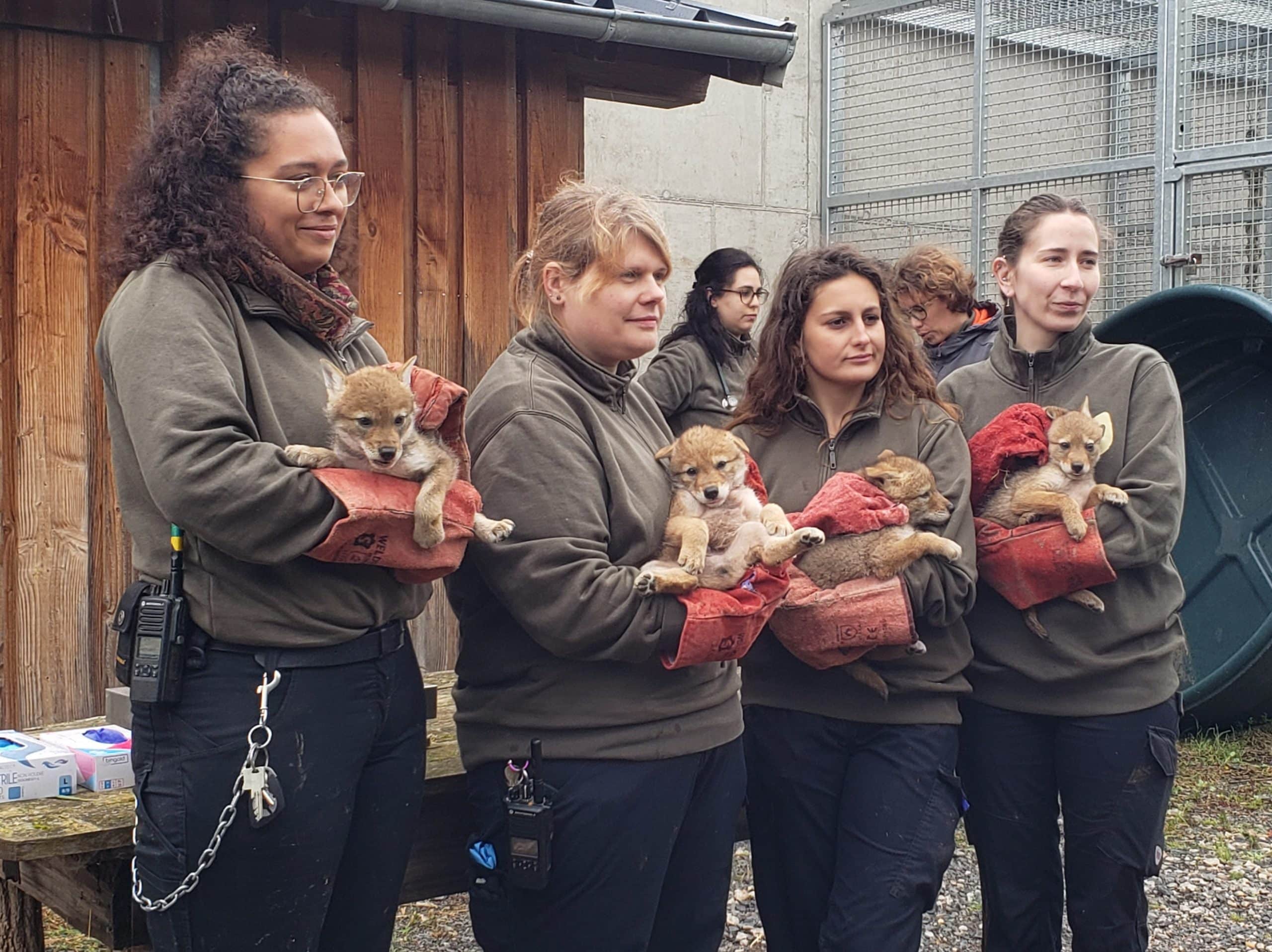 Jeudi 16 mai, quatre bébés coyotes âgés d’un mois ont été pucés pour marquer leur entrée au Parc animalier de Sainte Croix. Une opération périlleuse pour les soigneurs puisqu’un potentiel cinquième bébé a échappé au puçage.