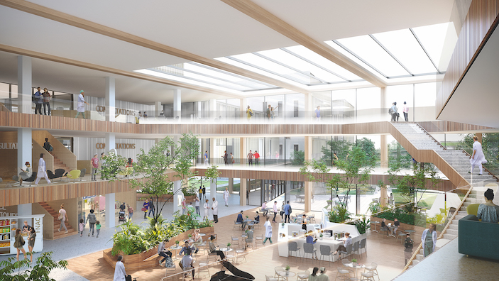 Pas question de construire le futur hôpital Elsan sans se préoccuper de l’environnement et du développement durable. Aussi le projet intègre-t-il dès sa conception des éléments forts pour en faire un bâtiment digne des enjeux actuels. Cela passe aussi bien par la récupération des eaux de pluie que de la pose de panneaux solaires, mais aussi une construction modulaire bas carbone (avec ossature en bois privilégiée et préfabrication d’éléments avec 150 t de matériaux de construction biosourcés) ou une protection de la chaleur du soleil via de larges surfaces vitrées électrochromées ou des pare-soleil orientables en fonction de la saison ou de l’heure de la journée.