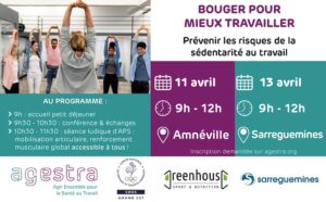 En parallèle, le partenariat entre AGESTRA et le CROS Grand Est passe également par la promotion et le développement du dispositif Prescri’Mouv. Ce programme régional a pour objectif d’améliorer la santé et la condition physique des patients adultes souffrant de certaines pathologies grâce à la pratique d’une activité physique et sportive (APS). Les professionnels de santé d’AGESTRA ont été sensibilisés à ce dispositif et peuvent ainsi apporter aux salariés rencontrés toutes les informations nécessaires pour bénéficier de Prescri’Mouv. Ce dernier permet notamment de lutter contre les effets de la sédentarité et de prévenir les maladies chroniques. Vous êtes conviés à deux matinées exceptionnelles organisées par AGESTRA et le CROS Grand Est. Le 11 avril à Amnéville et le 13 avril à Sarreguemines, vous aurez l’opportunité de pratiquer une activité physique et sportive (APS) adaptée à tous, et d’échanger avec des professionnels de santé qui sauront, de manière interactive, vous donner des moyens de prévention concrets face aux risques induits par la sédentarité en entreprise. Ces deux matinées seront l’occasion de découvrir les bienfaits de l’activité physique et sportive en milieu professionnel, et de comprendre comment mettre en place une offre d’APS au sein de votre entreprise. Vous pourrez également bénéficier des conseils de nos experts pour améliorer votre qualité de vie au travail. Ne manquez pas cette occasion unique de prendre soin de vous et de vos employés. Inscrivez-vous dès maintenant aux deux matinées organisées par AGESTRA et le CROS Grand Est ! Pour vous inscrire gratuitement : https://agestra.org/events/event/prevenir-sedentarite-cros/