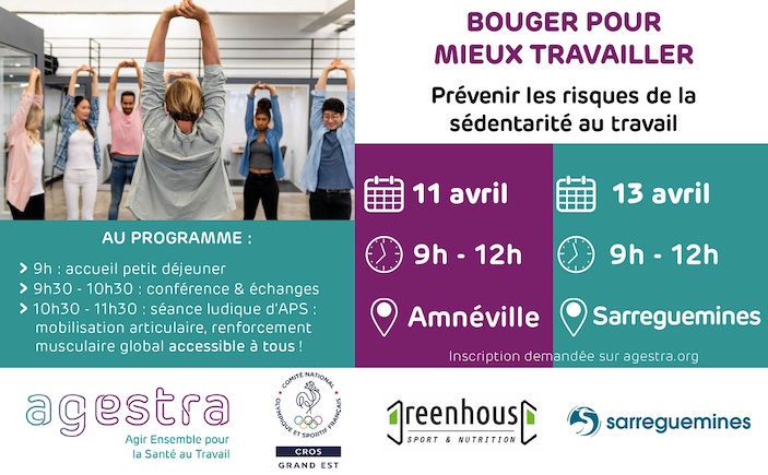 En parallèle, le partenariat entre AGESTRA et le CROS Grand Est passe également par la promotion et le développement du dispositif Prescri’Mouv. Ce programme régional a pour objectif d’améliorer la santé et la condition physique des patients adultes souffrant de certaines pathologies grâce à la pratique d’une activité physique et sportive (APS). Les professionnels de santé d’AGESTRA ont été sensibilisés à ce dispositif et peuvent ainsi apporter aux salariés rencontrés toutes les informations nécessaires pour bénéficier de Prescri’Mouv. Ce dernier permet notamment de lutter contre les effets de la sédentarité et de prévenir les maladies chroniques. Vous êtes conviés à deux matinées exceptionnelles organisées par AGESTRA et le CROS Grand Est. Le 11 avril à Amnéville et le 13 avril à Sarreguemines, vous aurez l’opportunité de pratiquer une activité physique et sportive (APS) adaptée à tous, et d’échanger avec des professionnels de santé qui sauront, de manière interactive, vous donner des moyens de prévention concrets face aux risques induits par la sédentarité en entreprise. Ces deux matinées seront l’occasion de découvrir les bienfaits de l’activité physique et sportive en milieu professionnel, et de comprendre comment mettre en place une offre d’APS au sein de votre entreprise. Vous pourrez également bénéficier des conseils de nos experts pour améliorer votre qualité de vie au travail. Ne manquez pas cette occasion unique de prendre soin de vous et de vos employés. Inscrivez-vous dès maintenant aux deux matinées organisées par AGESTRA et le CROS Grand Est ! Pour vous inscrire gratuitement : https://agestra.org/events/event/prevenir-sedentarite-cros/