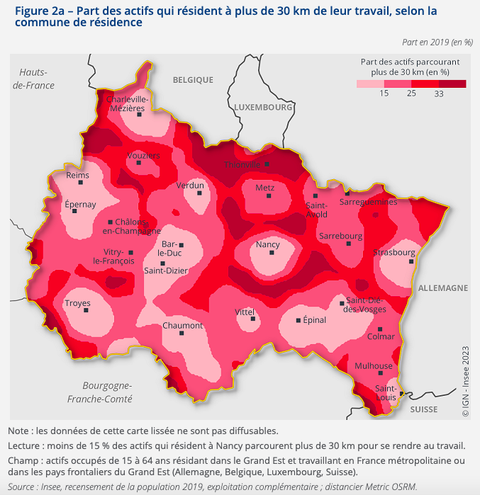 Trois quarts de ces longs trajets sont le fait de travailleurs frontaliers ou de navetteurs entre deux grandes villes. Ainsi, à proximité de la frontière luxembourgeoise, plus d’un travailleur sur trois parcourt une longue distance.