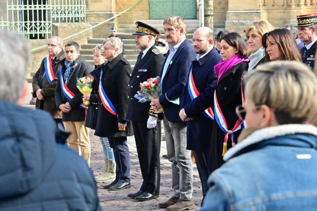 À Metz, la cérémonie s’est tenue en présence de Béatrice Lausch (troisième en partant de la gauche), la mère de Marie, de Jean-François Dymarski (sixième), le père de Mathias, du préfet et d’élus. Photo Philippe Gisselbrecht/Ville de Metz