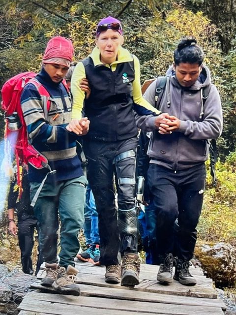 Avec l’aide d’une orthèse mécatronique, Anita Fatis a pu concrétiser son objectif en réalisant son premier trek debout au Népal. Photo DR