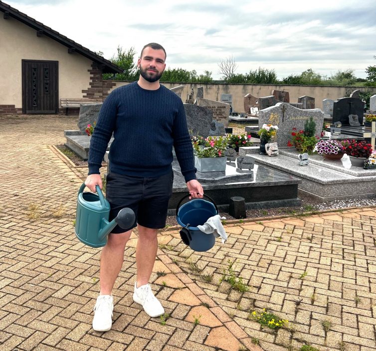 À 22 ans à peine, Quentin Gironis qui réside à Bettborn a créé son auto-entreprise qu’il nomme « Sépul’Pur », ce qui pour lui rime avec « sépulture, pureté et beauté ». Il se rend chaque jour dans les cimetières, muni de brosses, chiffons, arrosoir, savon noir, quelques matériaux de rénovation, et une grande énergie pour son travail. Sa mission, que lui confient des familles, est d’entretenir, embellir, mais également fleurir, et rénover les sépultures de leurs disparus.