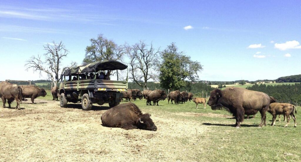 Les safaris ont lieu les mercredis, samedis, dimanches et à raison de deux par jour en juillet et en août et les visiteurs trouvent de quoi se restaurer sur place. L’exploitation a par ailleurs le label de ferme pédagogique et les scolaires peuvent bénéficier d’un accompagnement spécifique avec panneaux explicatifs, une plateforme d’observation pour les écoles avec mise à disposition de jumelles, boussoles… Un hall de réception a été aménagé. Robin Chall qui fut dix ans durant président de l’association des éleveurs de bison de France qui compte 15 élevages dont 3 de plus de 100 bisons est en contact avec les éleveurs du monde entier notamment du Canada procédant à des échanges, ventes fournissant également les zoos. L’élevage répond aux mêmes règles sanitaires qu’un troupeau de bovins et est suivi par un vétérinaire attitré, l’éleveur disposant par ailleurs d’un certificat de capacité pour élever les bisons et d’ouverture d’élevage au public.