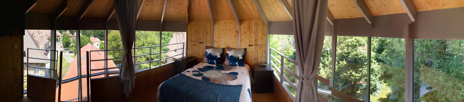 Conçu par la municipalité de Phalsbourg, ce gîte insolite est niché à 14 mètres au-dessus du sol. Au sommet de ce château d’eau datant de la fin du XIXe siècle, un espace de vie a été totalement aménagé en 2015 en une pièce ronde toute vitrée à la place de l’ancienne cuve. Une cuisine équipée d’une terrasse circulaire permet d’accueillir trois personnes, une chambre à coucher, située sous le toit en mezzanine, offre une vue imprenable sur la ville, tandis que la salle de bain, elle, se trouve sur le premier palier de l’édifice, à quelques mètres du sol. Pour pouvoir profiter de cette nuit originale sous les étoiles de Phalsbourg, il faudra gravir les 53 marches de l’escalier en colimaçon qui mène en haut du bâtiment, en s’assurant de ne rien avoir oublié dans sa voiture.
