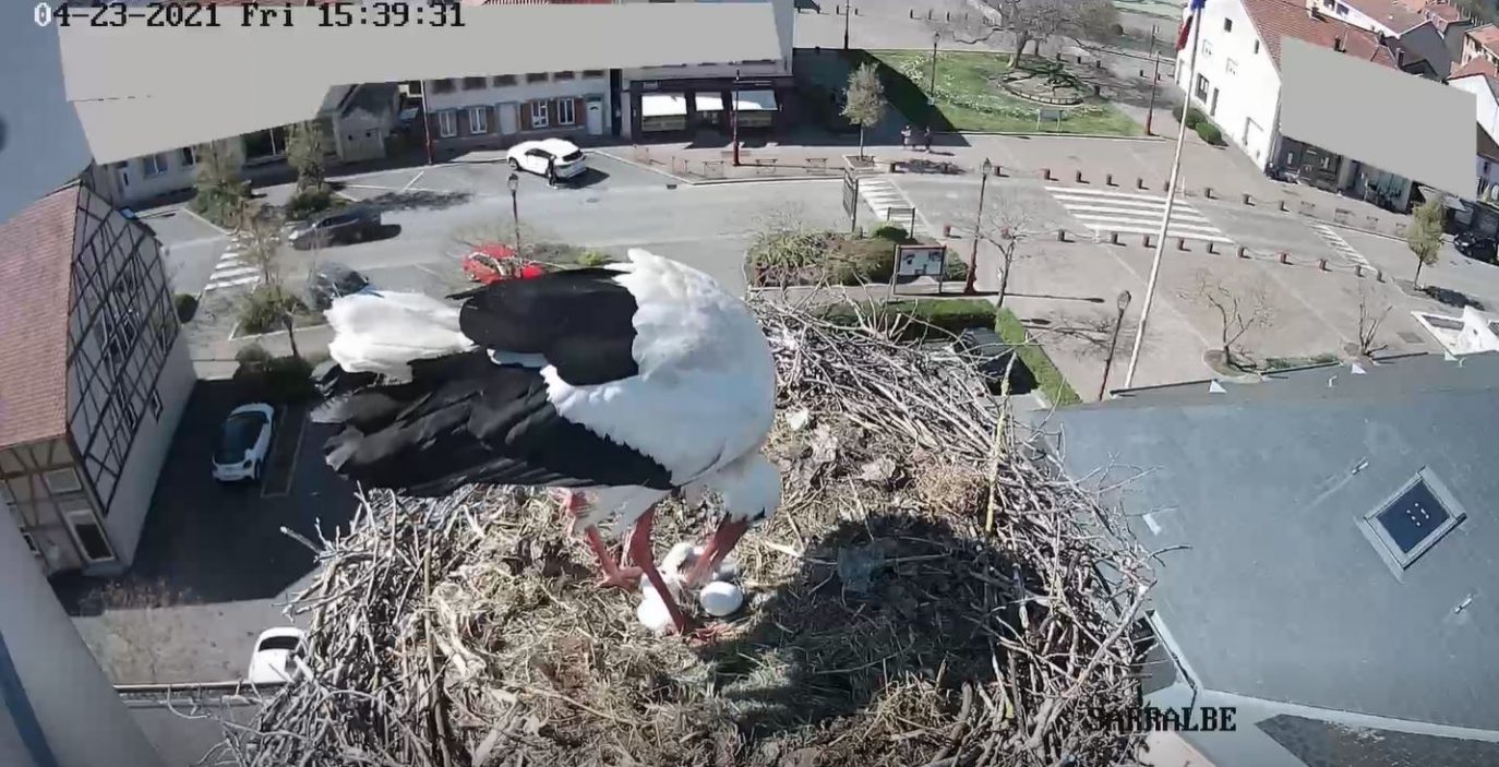 Le temps des éclosions est arrivé. Après avoir passé 32 jours à être couvé à tour de rôle par Maurice et Mélodie, le premier cigogneau de ce couple phare de cigognes, installé à Sarralbe, est arrivé tôt, ce vendredi 23 avril. Située au sud-est de Sarreguemines, cette ville mosellane accueille chaque année une trentaine de couples d’oiseaux. Un seul d’entre eux est filmé en permanence par une webcam, installée sur le toit de la mairie depuis cinq ans, et remplacée cette année par une caméra haute définition, qui enregistre également les sons. Un dispositif qui permet de ne rien rater des naissances, puisque les quatre autres cigogneaux de Maurice et Mélodie ne devraient pas tarder à briser leurs coquilles. Il sera ensuite possible de les observer pendant au moins deux mois, avant leur premier envol.