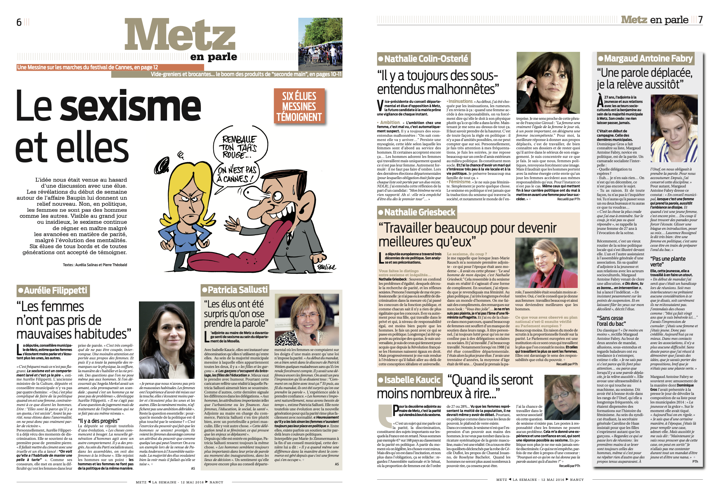 L’actualité et ses ironies… Début mai 2016, la rédaction de La Semaine travaille pour son numéro 574 sur un dossier consacré au sexisme en politique. Nous contactons six élues locales de générations et de sensibilités différentes, les six acceptent d’apporter leur témoignage. Les entretiens sont « bookés ». Et puis pendant le week-end éclate l’affaire Baupin, du nom de cet ancien dirigeant d’EELV accusé d’agressions sexuelles. Ce qui était un sujet d’initiative dans notre journal devient dès lors un fait national. Durant plusieurs jours, nombreuses sont les femmes responsables politiques à répondre aux télés et aux radios dans une libération de la parole arrivée en France un an avant #MeToo.