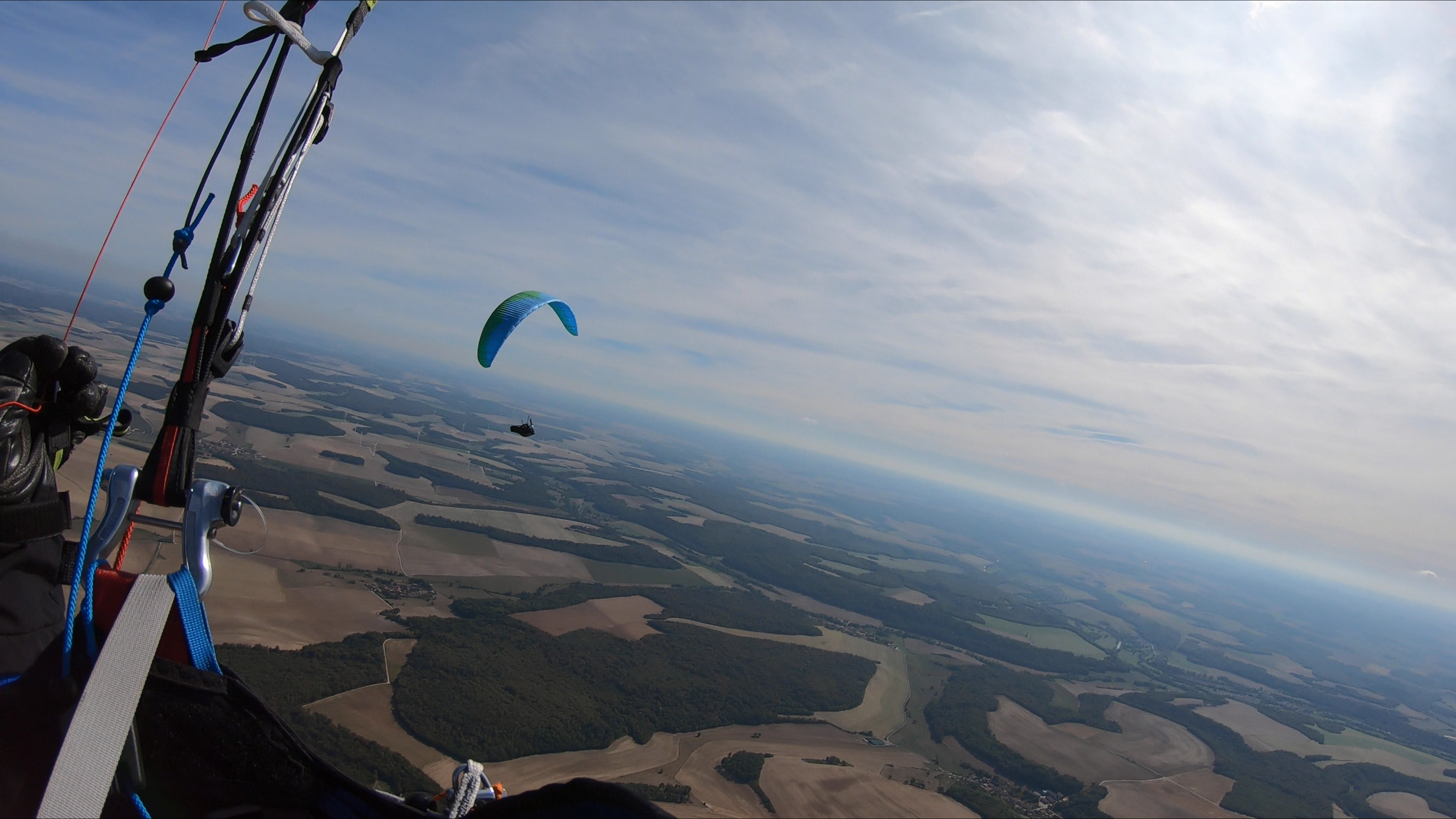 En vol au-dessus de Volmerange-les-Mines, Sandra Antony et sa voile vert et bleu. Photo DR